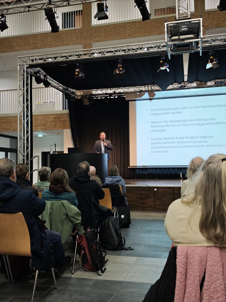 Im zweiten Vortrag beleuchtete Ottmar Ilchmann, Landwirt und Vorsitzender der Arbeitsgemeinschaft bäuerliche Landwirtschaft Niedersachsen, die Produktionsseite unseres Ernährungssystems. Er ordnete aktuelle agrarpolitische Entwicklungen ein. Von der gemeinsamen Agrarpolitik der EU mit Blick auf geplante Änderungen ab 2027 über den Niedersächsischen Weg bis hin zu möglichen Auswirkungen internationaler Handelsabkommen wie Mercosur auf regionale Betriebe. Dabei wurde deutlich, unter welchem wirtschaftlichen und politischen Druck viele landwirtschaftliche Betriebe stehen und wie wichtig faire Rahmenbedingungen, Planungssicherheit und gesellschaftliche Wertschätzung für eine zukunftsfähige, nachhaltige Landwirtschaft sind.